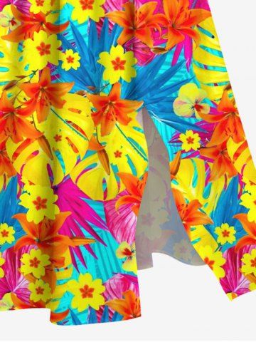Plus Size Tropical Flowers Leaf Print Split Hawaii Midi Dress - Yellow - 1x