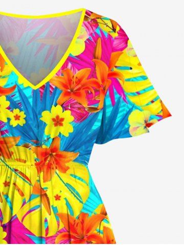 Plus Size Tropical Flowers Leaf Print Split Hawaii Midi Dress - Yellow - 6x
