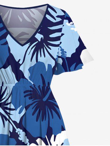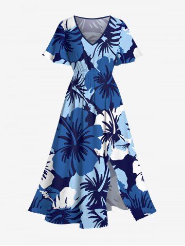 Plus Size Tropical Hibiscus Flower Print Split Hawaii Midi Dress - Blue - 5x