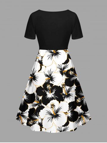 Plus Size Tropical Hibiscus Flowers Print Cinched Hawaii Dress - Black - 1x