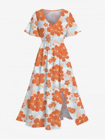 Plus Size Tropical Hibiscus Flowers Print Split Hawaii Midi Dress - Orange - 1x