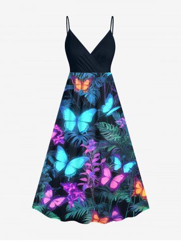 Graphic Dresses > Plus Size Tropical Leaf Branch Colorful Glitter Butterfly Print Hawaii Surplice A Line Cami Dress
