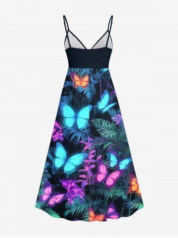 Graphic Dresses > Plus Size Tropical Leaf Branch Colorful Glitter Butterfly Print Hawaii Surplice A Line Cami Dress