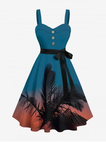 Graphic Dresses > Plus Size Tropical Leaf Coconut Tree Ombre Print Buttons Turn Down Collar Hawaii Dress With Belt