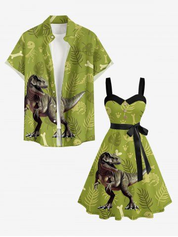 Plus Size Tropical Leaf Dinosaur Print Hawaii Button A Line Dress with Removable Belt - Green Yellow - Xs