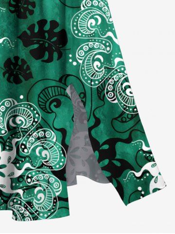 Plus Size Tropical Leaf Floral Pattern Print Split Hawaii Midi Dress - Green - 1x