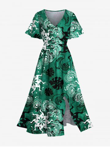 Plus Size Tropical Leaf Floral Pattern Print Split Hawaii Midi Dress - Green - 5x