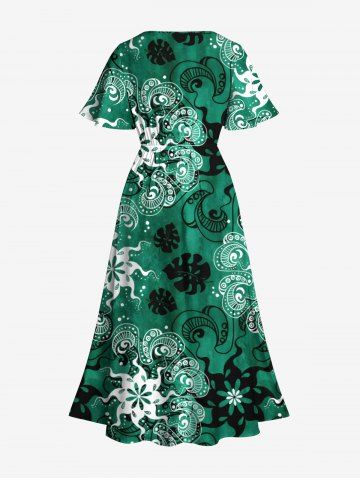 Plus Size Tropical Leaf Floral Pattern Print Split Hawaii Midi Dress - Green - 6x