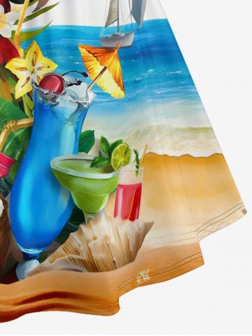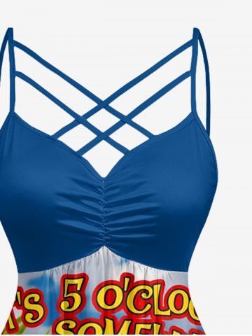 Plus Size Tropical Leaf Flower Parrot Flamingo Sea Print Hawaii Ruched Crisscross A Line Dress - Blue - M