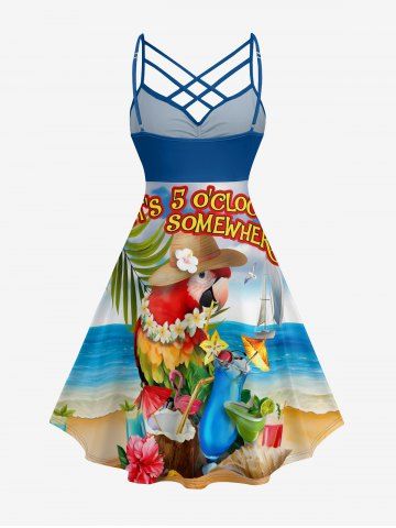 Plus Size Tropical Leaf Flower Parrot Flamingo Sea Print Hawaii Ruched Crisscross A Line Dress - Blue - 4x