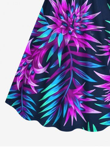 Plus Size Tropical Leaf Flower Print Cinched Hawaii Dress - Purple - S