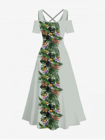 Graphic Dresses > Plus Size Tropical Leaf Flower Print Cold Shoulder Crisscross Hawaii Maxi Dress