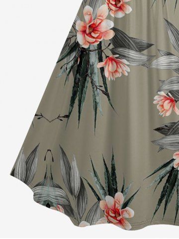 Graphic Dresses > Plus Size Tropical Leaf Flower Print Hawaii Ruched Crisscross Strappy A Line Cami Dress
