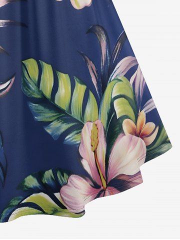 Plus Size Tropical Leaf Flower Print Hawaii Ruched Crisscross Strappy A Line Dress - Deep Blue - 4x