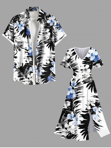 Plus Size Tropical Leaf Flower Print Hawaii Split Pocket A Line Midi Dress - Black - Xs