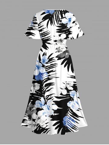 Graphic Dresses > Plus Size Tropical Leaf Flower Print Hawaii Split Pocket A Line Midi Dress