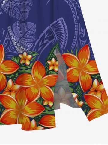 Plus Size Tropical Leaf Flower Print Hawaii Split Pocket A Line Midi Dress - Blue - S
