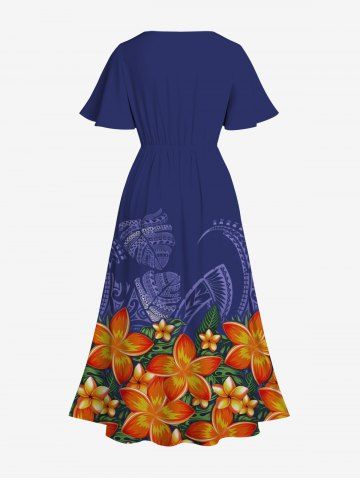 Plus Size Tropical Leaf Flower Print Hawaii Split Pocket A Line Midi Dress - Blue - 2x