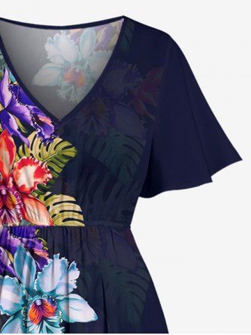 Plus Size Tropical Leaf Flower Print Hawaii Split Pocket A Line Midi Dress - Deep Blue - Xs