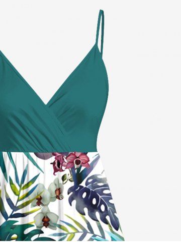 Plus Size Tropical Leaf Flower Print Hawaii Surplice A Line Cami Dress - Green - 3x