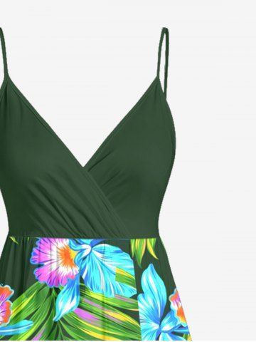 Plus Size Tropical Leaf Flower Print Hawaii Surplice A Line Cami Dress - Deep Green - Xxs