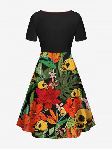 Plus Size Tropical Leaf Flower Skull Print Hawaii Cinched A Line Dress - Black - Xs