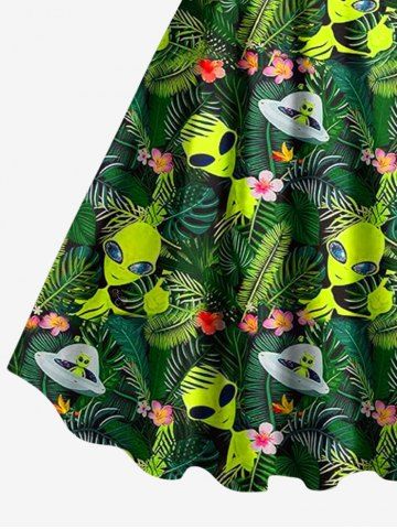 Plus Size Tropical Leaf Flowers Elien UFO Print Hawaii Tank Dress - Green - 4x