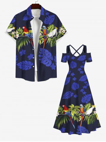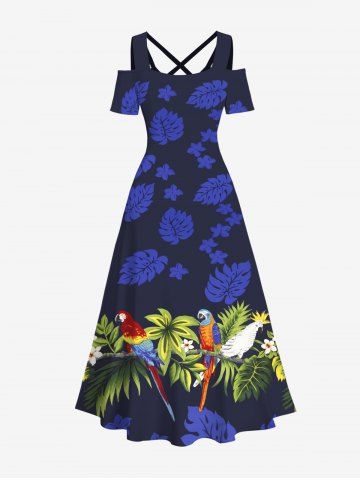 Graphic Dresses > Plus Size Tropical Leaf Flowers Parrot Birds Print Cold Shoulder Crisscross Hawaii Maxi Dress