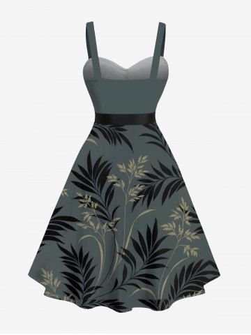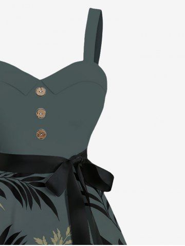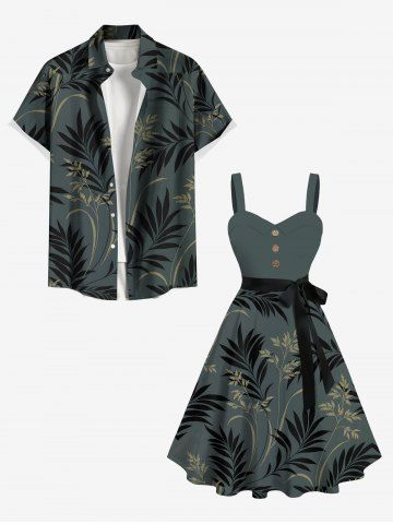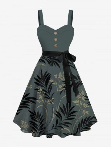 Graphic Dresses > Plus Size Tropical Leaf Flowers Print Buttons Turn Down Collar Hawaii Dress With Belt