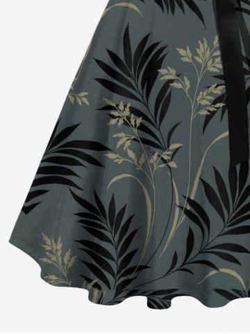 Plus Size Tropical Leaf Flowers Print Buttons Turn Down Collar Hawaii Dress With Belt - Black - 2x