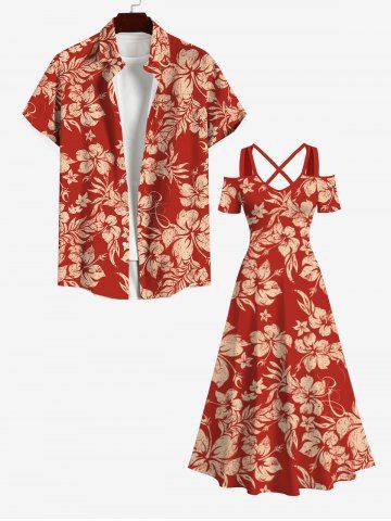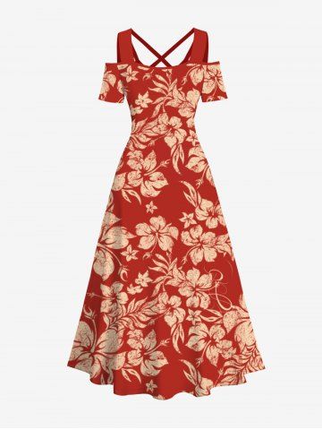 Plus Size Tropical Leaf Flowers Print Crisscross Cold Shoulder Hawaii Maxi Dress - Red - L