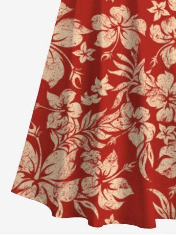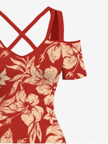 Plus Size Tropical Leaf Flowers Print Crisscross Cold Shoulder Hawaii Maxi Dress - Red - 5x