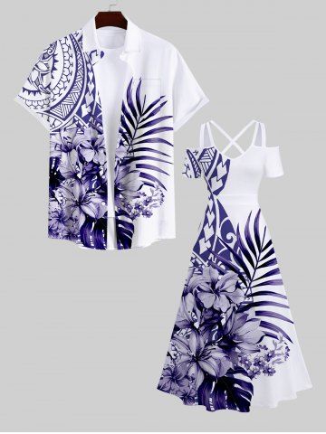 Plus Size Tropical Leaf Flowers Print Crisscross Cold Shoulder Hawaii Maxi Dress - White - M