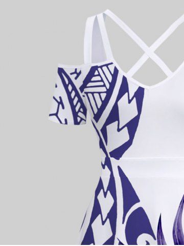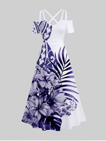 Plus Size Tropical Leaf Flowers Print Crisscross Cold Shoulder Hawaii Maxi Dress - White - 2x