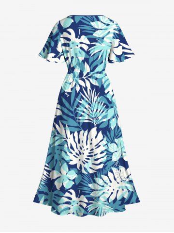 Plus Size Tropical Leaf Flowers Print Hawai Split Midi Dress - Blue - 5x