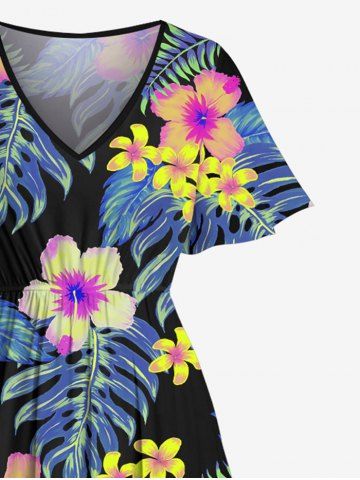 Plus Size Tropical Leaf Flowers Print Split Hawaii Midi Dress - Black - S
