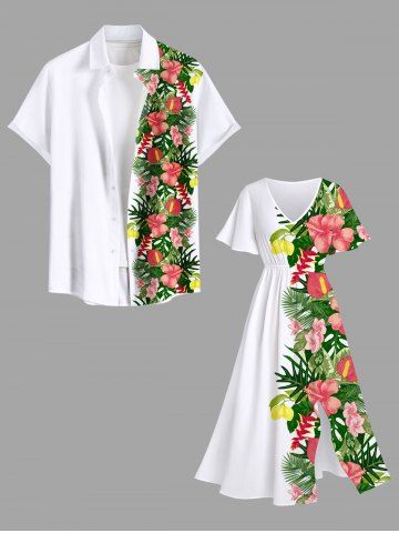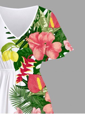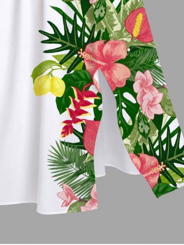 Plus Size Tropical Leaf Flowers Print Split Hawaii Midi Dress - White - 6x