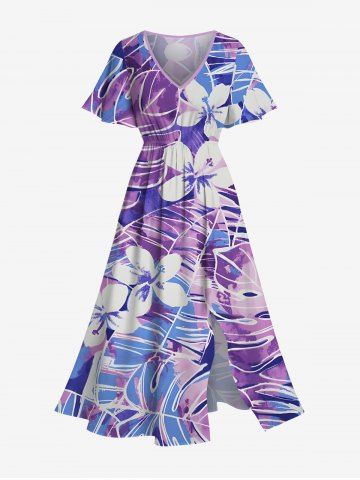 Plus Size Tropical Leaf Flowers Print Split Hawaii Midi Dress - Purple - M