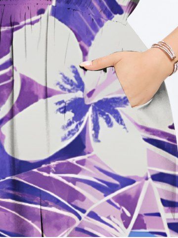 Plus Size Tropical Leaf Flowers Print Split Hawaii Midi Dress - Purple - 1x