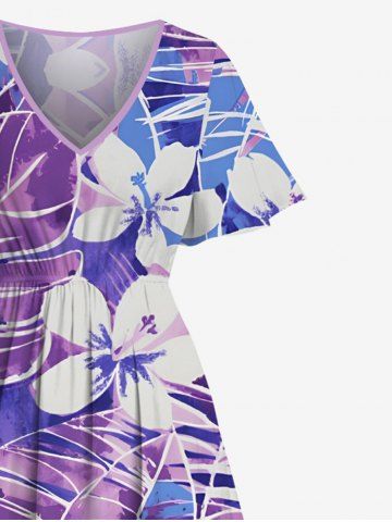 Plus Size Tropical Leaf Flowers Print Split Hawaii Midi Dress - Purple - 4x