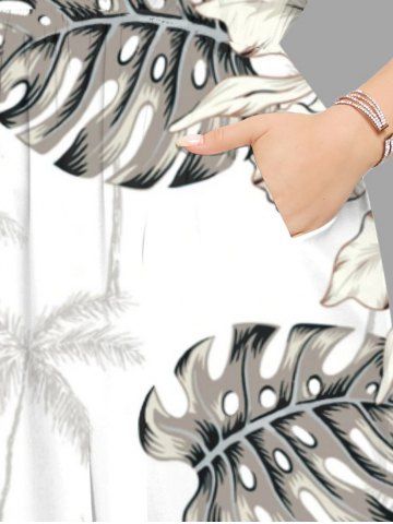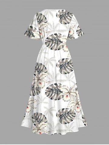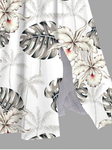 Plus Size Tropical Leaf Flowers Print Split Hawaii Midi Dress - White - S