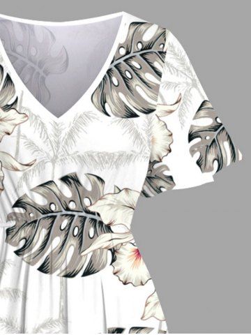 Plus Size Tropical Leaf Flowers Print Split Hawaii Midi Dress - White - 1x