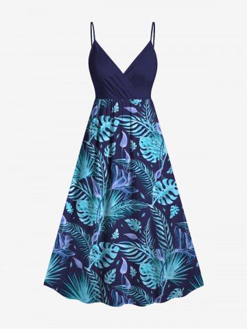 Plus Size Tropical Leaf Flowers Print Surplice Hawaii Cami Dress - Blue - S