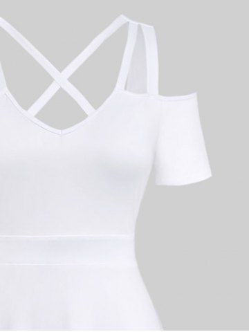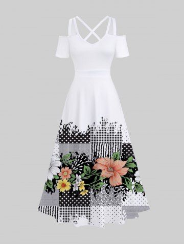 Plus Size Tropical Leaf Flowers Scarf Pattern Print Cold Shoulder Crisscross Hawaii Maxi Dress - White - 4x