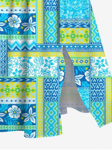 Plus Size Tropical Leaf Flowers Scarf Print Split Hawaii Midi Dress - Turquoise - 2x