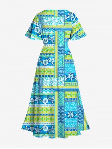 Plus Size Tropical Leaf Flowers Scarf Print Split Hawaii Midi Dress - Turquoise - 4x