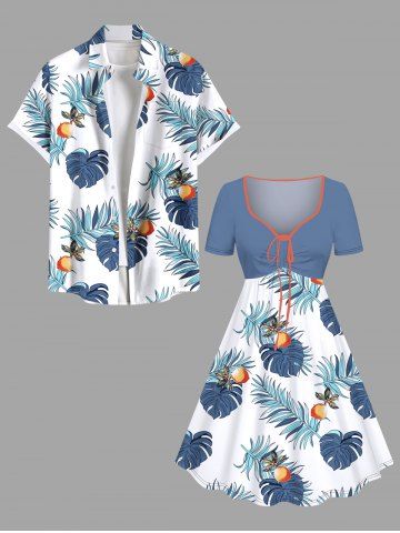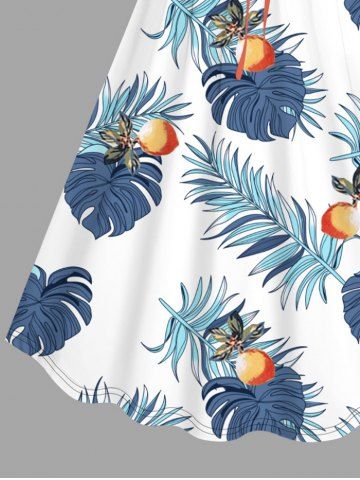 Plus Size Tropical Leaf Fruit Print Cinched Hawaii Dress - Blue - 3x