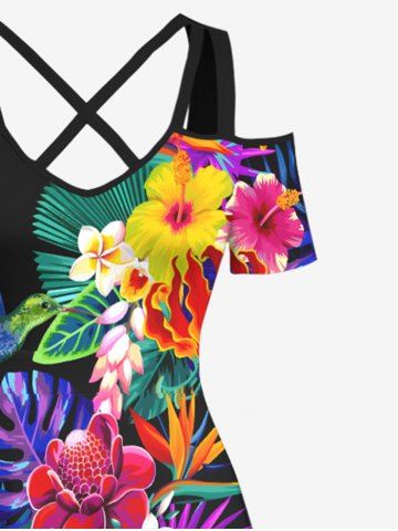 Plus Size Tropical Leaf Hibiscus Flower Bird Print Cold Shoulder Crisscross Hawaii Maxi Dress - Black - 1x