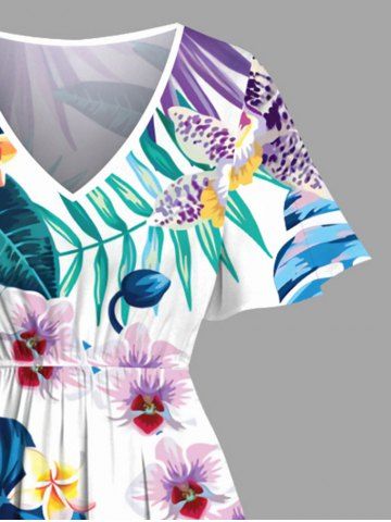 Plus Size Tropical Leaf Hibiscus Flower Branch Print Hawaii Split Pocket A Line Midi Dress - White - Xxs