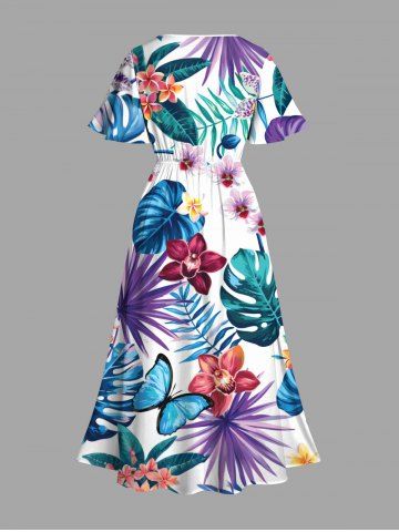 Plus Size Tropical Leaf Hibiscus Flower Branch Print Hawaii Split Pocket A Line Midi Dress - White - S